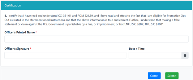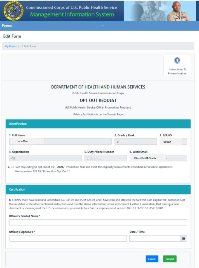 Form PHS-7090 must be submitted using the online Forms system within CCMIS. This form requires the signature of the officer to certify their request to opt out of the current promotion year for which they are eligible. Officers not eligible for promotion for the current cycle will not have access to the Form PHS-7090. Officers will be notified of the outcome of their requests in accordance with POM 821.89 and a copy of the approved form will be indexed into the Confidential Section of the electronic Official Personnel File (eOPF).
