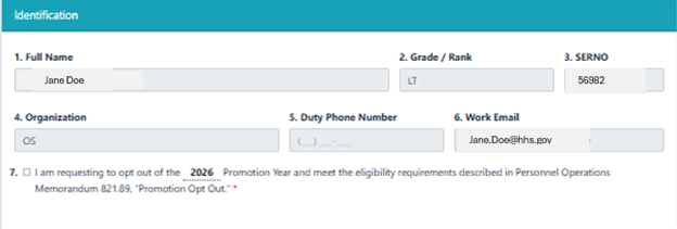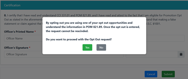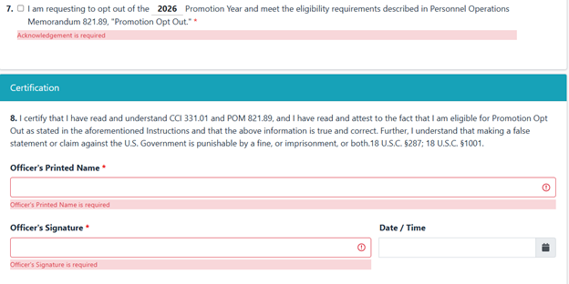 Check the box in Question #7 to indicate that you are requesting to opt out of the current promotion year. The corresponding year will auto-populate into this section.