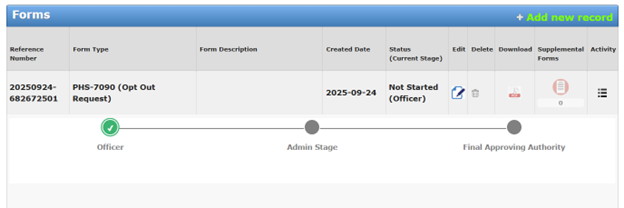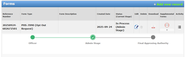 After Officer submission, the PHS-7090 will move to the admin stage for review before the final approval authority approves or rejects the request.