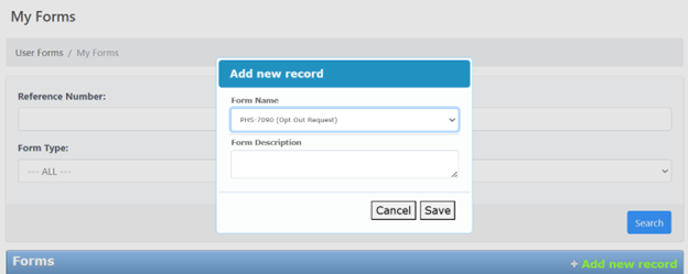 Ensure "PHS-7090 (Opt Out Request)" is selected then click the button labeled "Save"